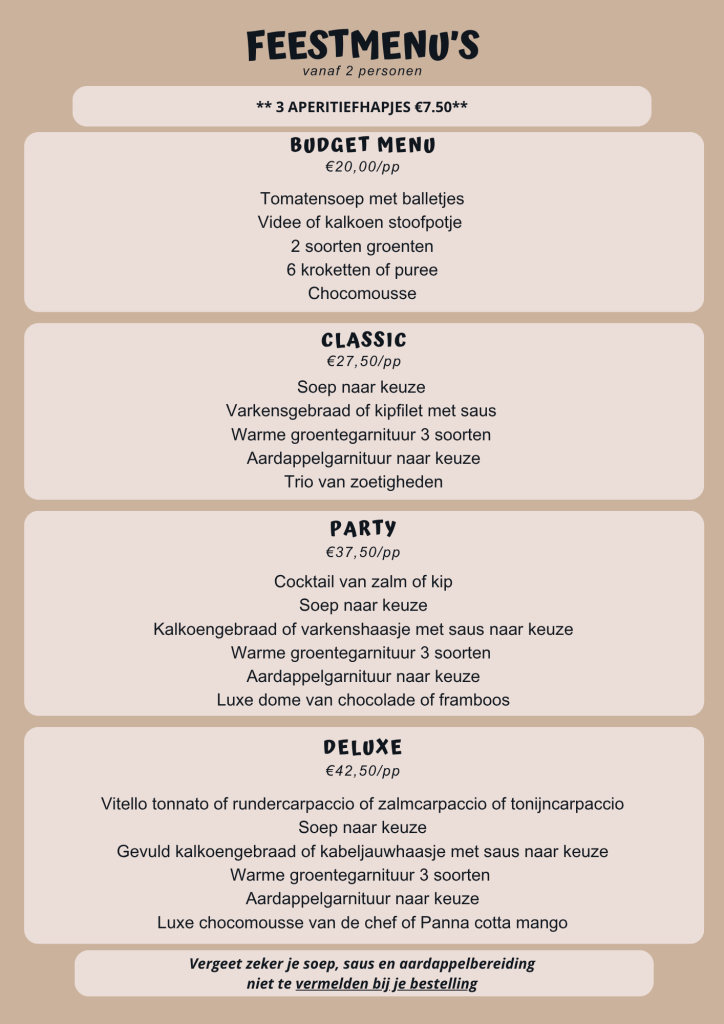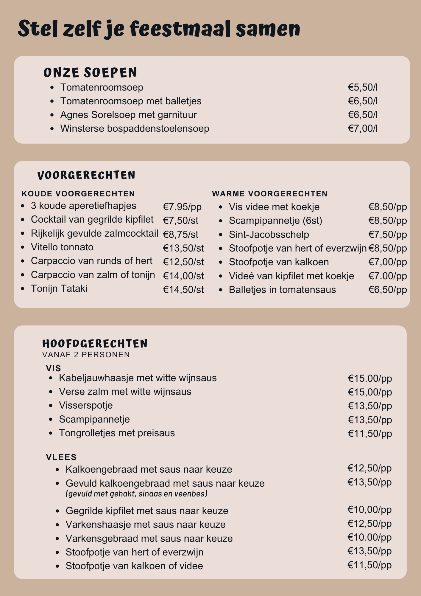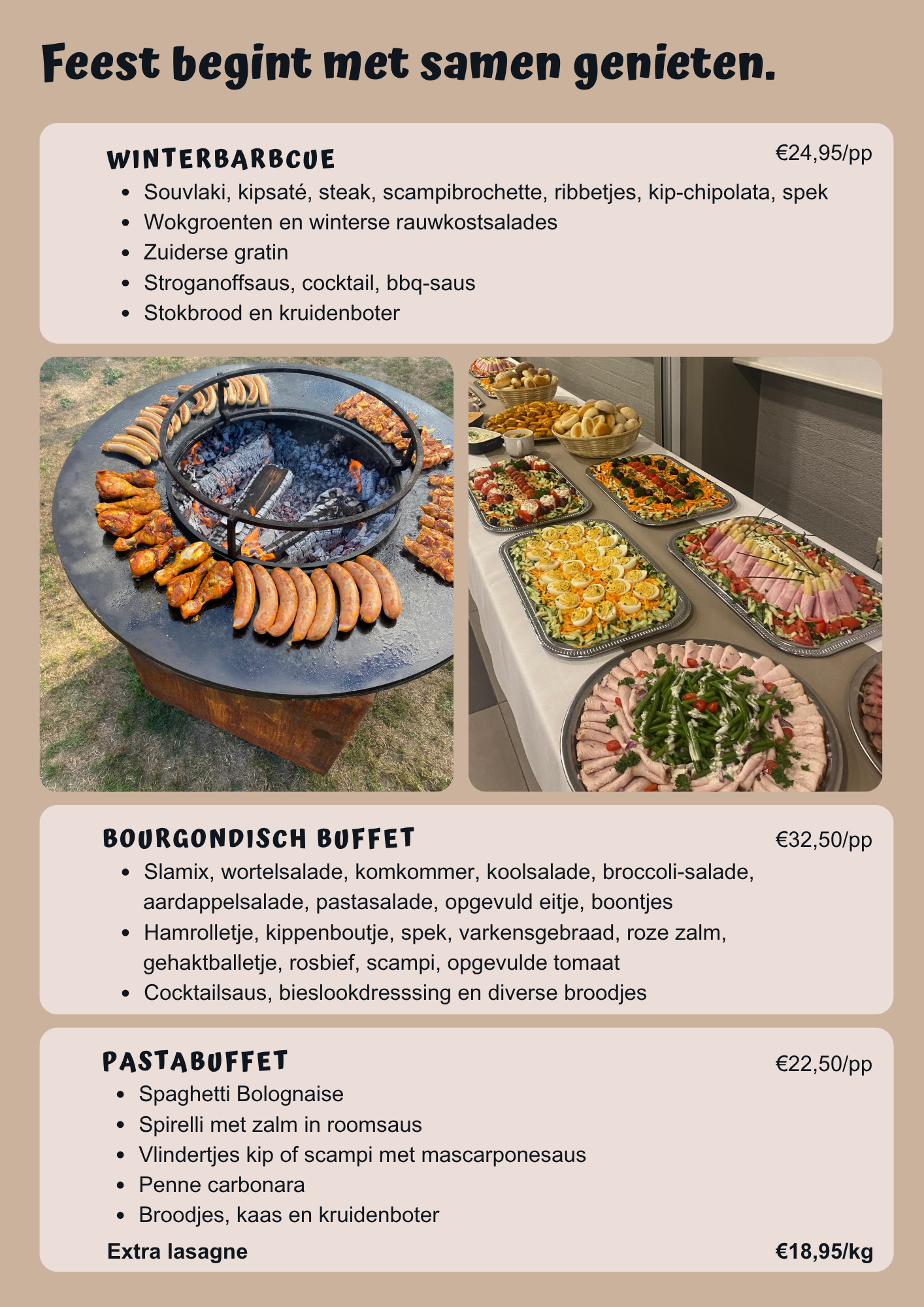 Met onze feestfolder, die elk jaar tijdens de feestdagen wordt uitgebracht, krijg je een handig overzicht van de vele mogelijkheden die ’t Winkeltje biedt voor jouw feest of speciale gelegenheid. Van barbecues en buffetten tot mini broodjes, tapas en gourmetopties, onze folder is een houvast om je wensen door te geven of gewoon om inspiratie op te doen.