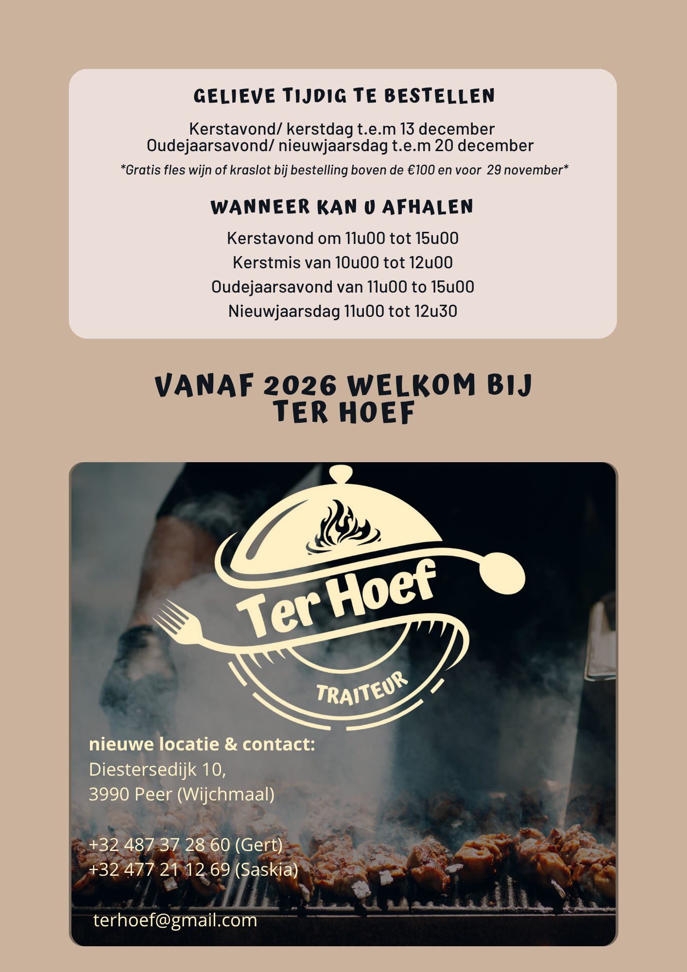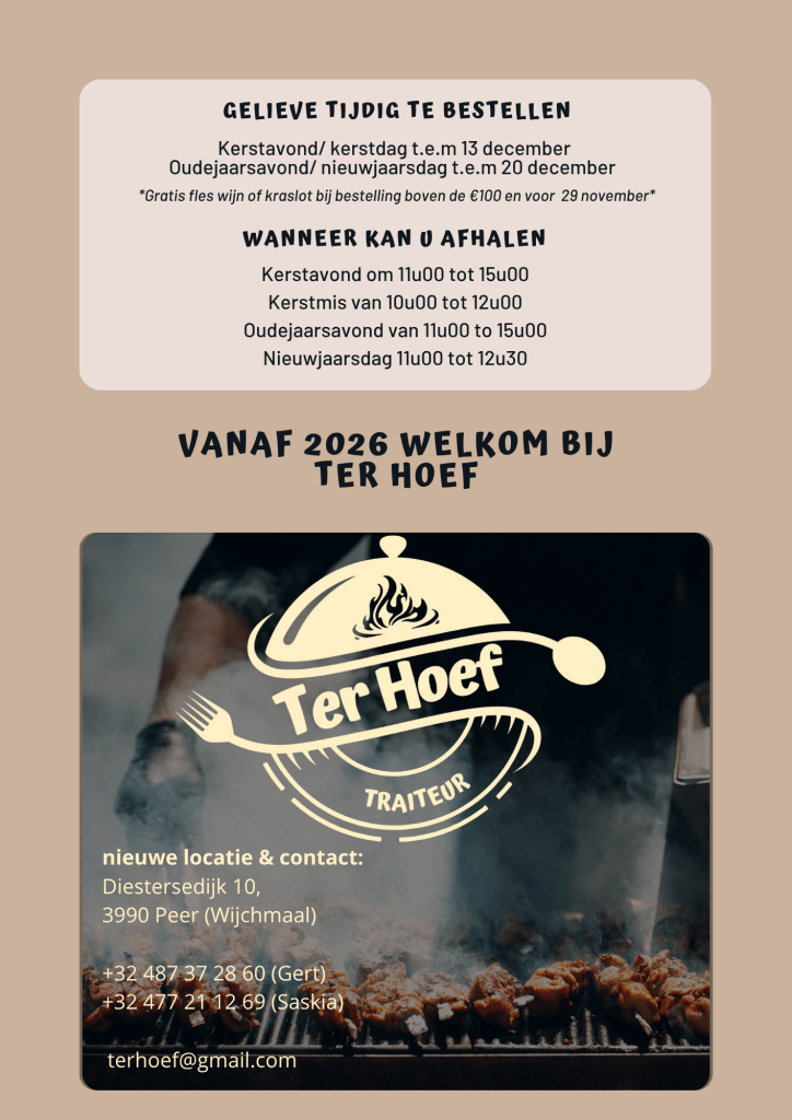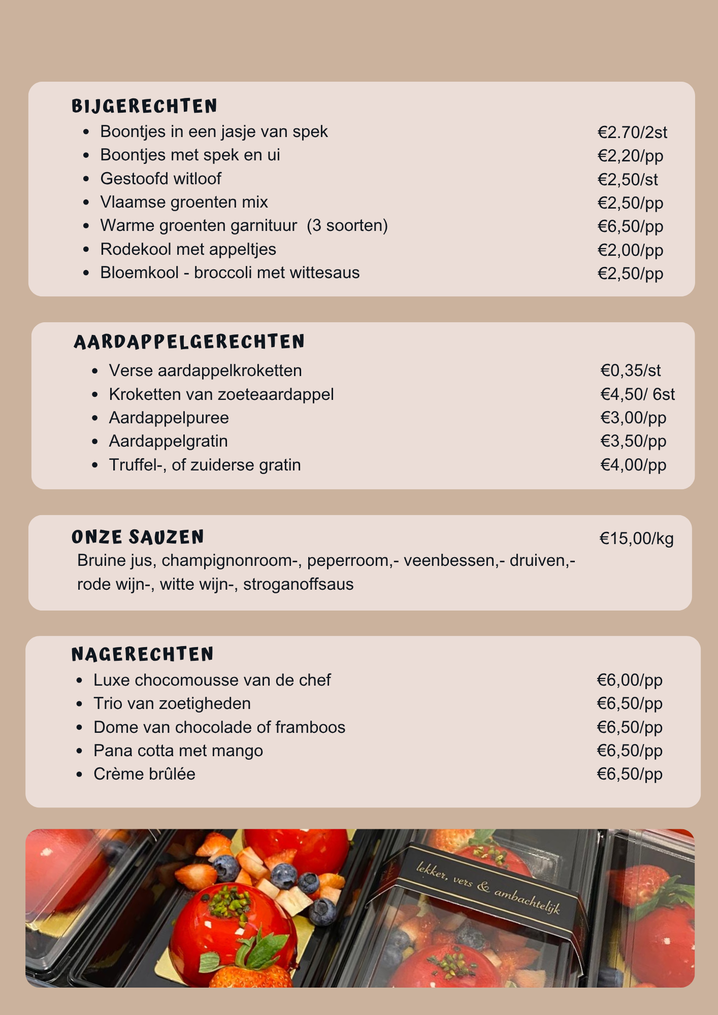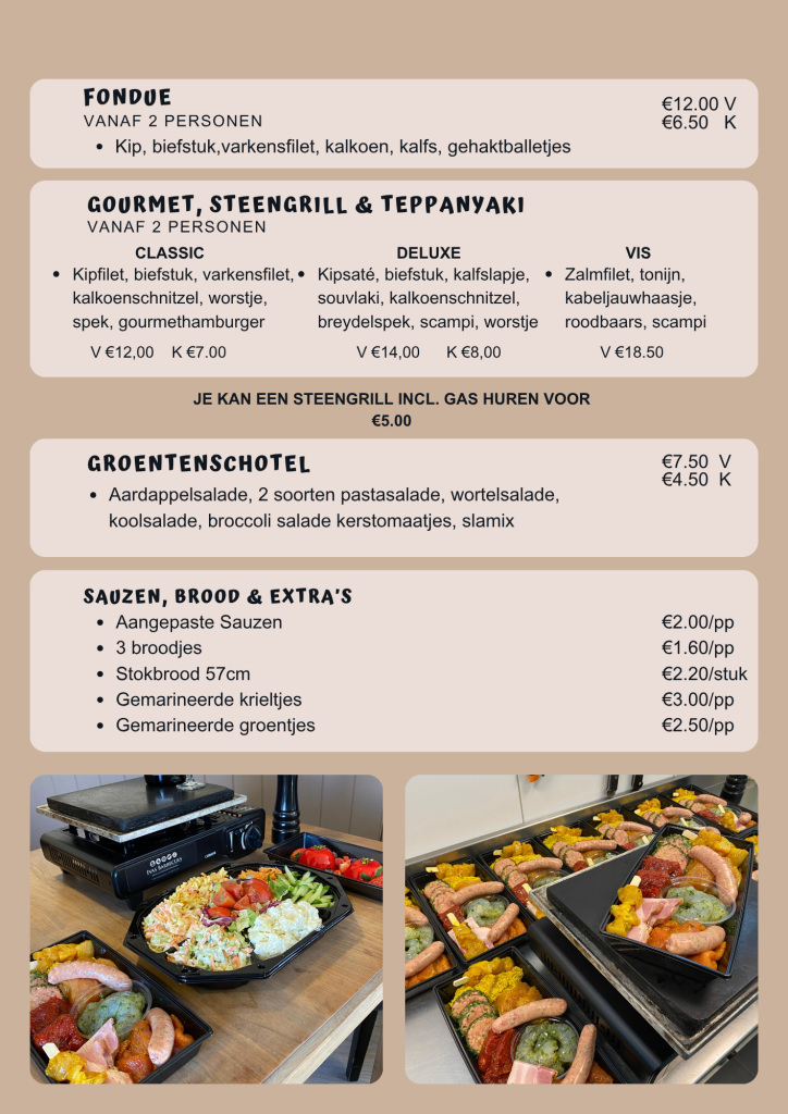 Met onze feestfolder, die elk jaar tijdens de feestdagen wordt uitgebracht, krijg je een handig overzicht van de vele mogelijkheden die ’t Winkeltje biedt voor jouw feest of speciale gelegenheid. Van barbecues en buffetten tot mini broodjes, tapas en gourmetopties, onze folder is een houvast om je wensen door te geven of gewoon om inspiratie op te doen.